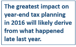 With a new administration taking shape in our nation’s capital after the elections, you can expect that significant tax reforms will be debated, and perhaps enacted, in the near future. But the greatest impact on year-end tax planning in 2016 will likely derive from what happened late last year, not what will happen next year.